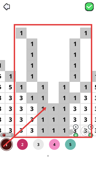 3、缩放图案至显示数字格子,长按数字1的区域点击快速完成该数字的批量填色操作。