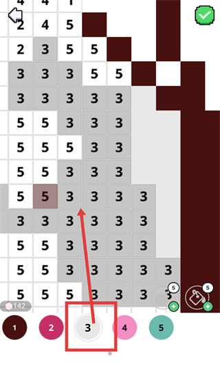4、完成数字1填色后,切换到数字3对应的颜色,继续为图案中数字3的格子进行填色。