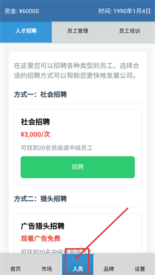 1、在【人才招聘】界面,可选择【社会招聘】-¥3,000/次获取20名低-中级员工,或看广告用【广告猎头招聘】得中-高级员工。