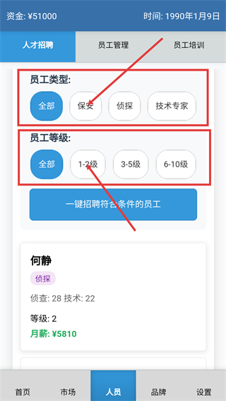 2、在【人才招聘】页,通过【员工类型】-【保安】与【员工等级】-1-2级筛选,再点【一键招聘符合条件的员工】快速招对应人员。