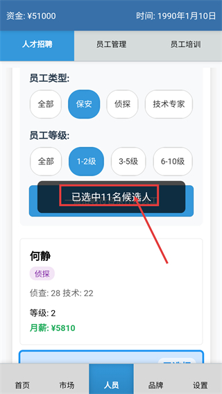 3、筛选【保安】-1-2级员工后,点击招聘按钮会显示【已选中11名候选人】,确认后即可完成该批员工的招聘。