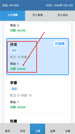 4、招聘后可查看员工信息,如【孙龙】-保安-等级1,月薪¥3240,点击可标记【已选择】来确定录用该员工。