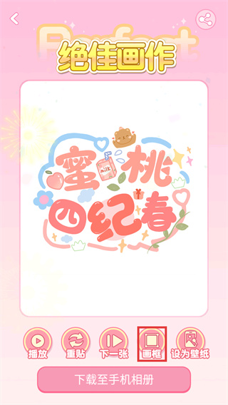 2、完成填色后点击下一张可继续挑战新模板,也能选择画框装饰画作,还能将作品设为壁纸保存。