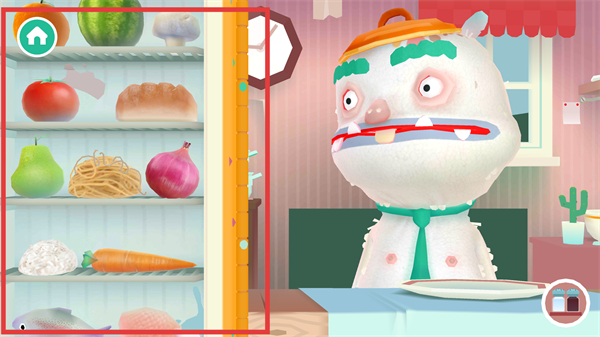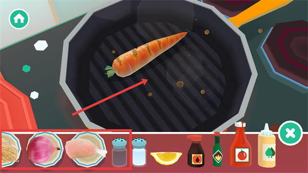 1、心仪的卡通角色,从左侧拖出胡萝卜、鱼等食材,用右侧厨具进行处理,开启烹饪之旅。