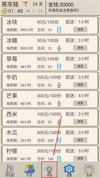 1、在【市场】界面中,按需点击食材对应的【进货】按钮采购物资,需注意不同食材的【保质期】与【配送】时长。