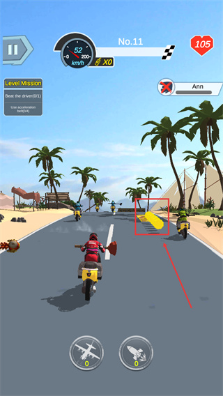 1、赛道中遇到【黄色金币】及时拾取,可以在商店中购买装扮与升级摩托车性能。