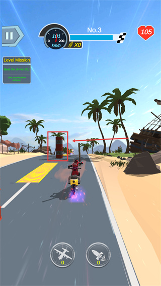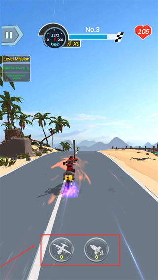 2、行驶时留意底部的技能按钮,虽初始数量为0,但后续可通过拾取道具解锁【飞机】【火箭】类技能。
