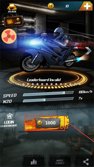 1、点击界面中的【1000】奖励按钮可获取对应资源,同时留意【SPEED】与【N2O】进度条以把控行驶状态。