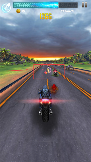 3、锁定前方对手后可触发攻击效果,能干扰其行驶节奏,同时借助加速保持【199km/h】的高速状态。
