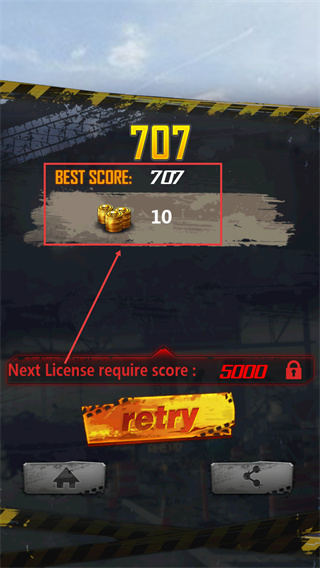 4、结算界面会显示【BEST-SCORE-707】与奖励,若未达成【Next-License-require-score-5000】可点击【retry】重赛。