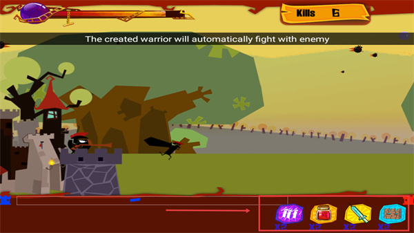 2、了解【The-created-warrior-will-automatically-fight-with-enemy】机制,创建的战士会自动与敌人战斗,关注【Kills-6】统计进度。