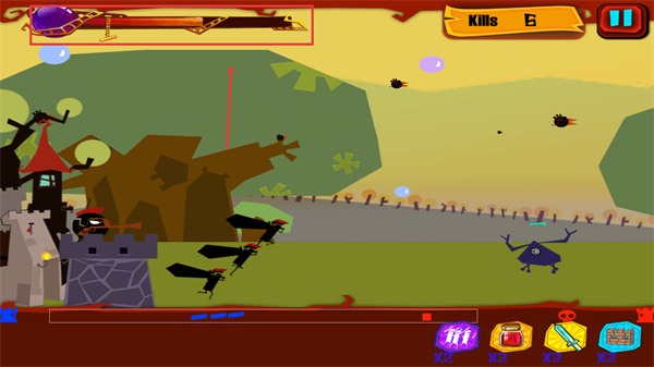 3、战斗中会出现多批敌人,可利用界面中的道具助力,同时留意【Kills-6】的变化来判断战局。