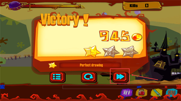 4、获得【Victory!】后可获取【945】奖励与星级评价,点击箭头按钮可进入下一关,也可选择重玩或查看菜单。