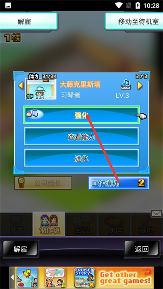 4、点击员工详情页的【强化】按钮,消耗对应道具提升员工等级,增强其工作能力与效率。