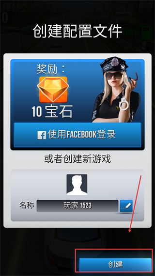 1、可选择【使用FACEBOOK登录】领【10宝石】,或直接填名称点【创建】开启新游戏。