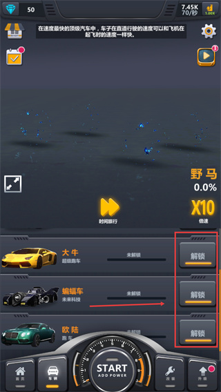 3、在车辆界面中,点击对应车辆右侧的【解锁】按钮,可解锁【大牛-超级跑车】等不同类型车辆。