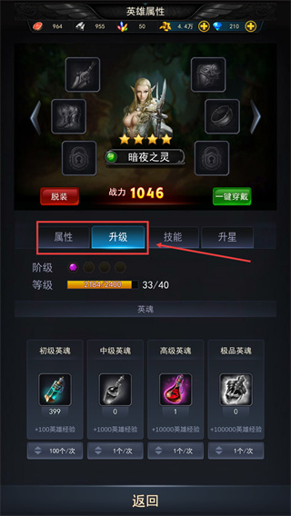 3、在英雄界面点击【升级】标签,使用【初级英魂】等道具可提升英雄等级,增加战力,助力后续战斗。