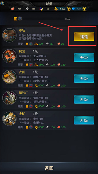 4、在城堡界面点击【建造】按钮解锁市场,市场可定时刷新资源与装备,同时升级民营、农田等建筑可提升资源产量。