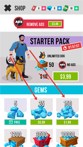 4、商店界面提供付费礼包钻石购买等选项,部分钻石可免费获取钻石可用于解锁道具移除广告等,合理利用商店资源能提升游戏推进效率。