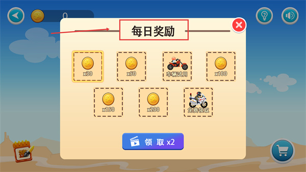 1、每日进入每日奖励界面,领取金币等资源,还可解锁车辆试用及免费领取车辆。