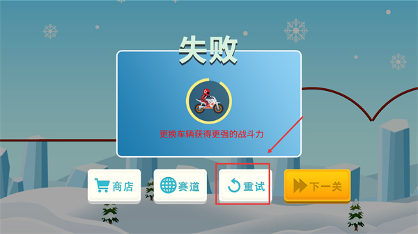 4、若关卡失败,点击重试按钮重新挑战,也可更换车辆提升战力,优化操作后再次尝试通关。