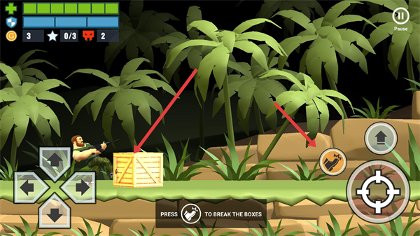 2、遇到地形落差时点击右侧跳跃按钮控制角色跳跃,跨越障碍后向木箱方向移动,保持移动路径的顺畅推进关卡进度。