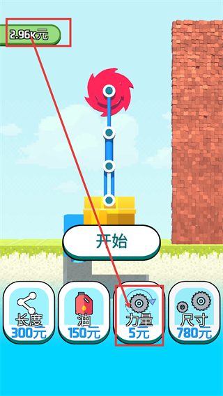 1、开局优先用【2.96k元】解锁【力量-5元】等属性,提升工具能力,再点击【开始】进入关卡。