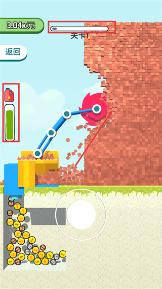 3、破坏墙体时,收集掉落的金币可积累资金,同时观察上方进度条,推进关卡进度以获取更多奖励。