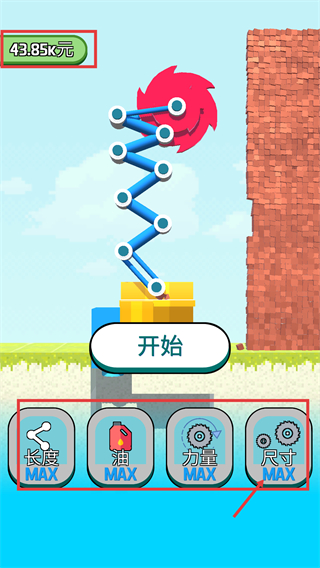 4、当属性达到【长度-MAX】【油-MAX】等满值状态时,点击【开始】可高效破坏墙体,快速积累【43.85k元】。