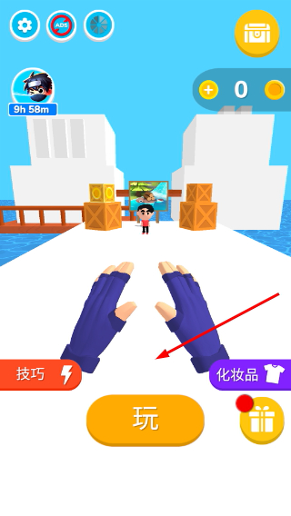 1、界面显示9h58m的时长,可点击底部的玩按钮开启游戏,同时可查看技巧等功能,准备进入游戏环节。