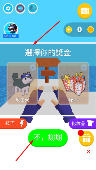 4、在选择你的奖金界面,可选择攻击犬或秘术奖励,也可点击不,谢谢跳过奖励,回到主界面。