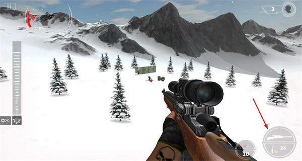 4、进入战斗场景后,可操作狙击枪瞄准目标,界面显示当前弹药数量等信息,开始执行清除敌方营地岗哨的任务。