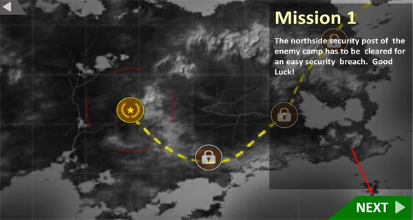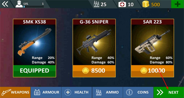 2、进入武器选择页面后,查看已装备的武器及其他可选武器,点击界面中的下一步按钮,进入到任务选择的界面。