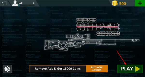 1、打开山地狙击手后,进入游戏界面,点击界面中的PLAY按钮,进入到武器选择的操作页面。